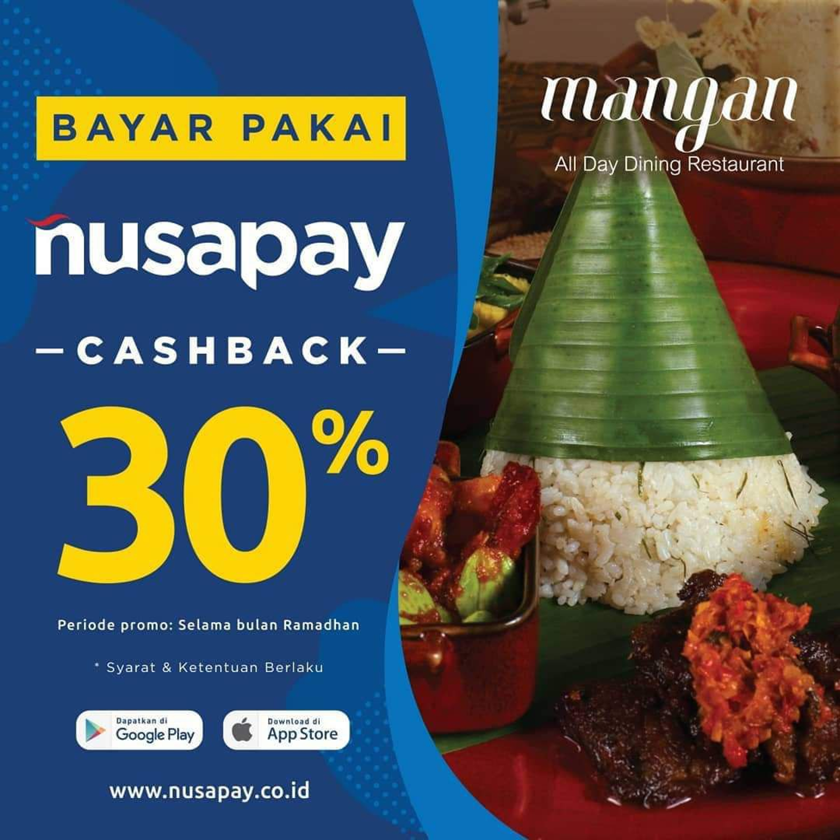 Yuk, Makan bareng teman, saudara, ataupun keluarga di Mangan Restaurant dengan pembayaran menggunakan Nusapay kamu bisa dapatkan cashback 30% loh... P...